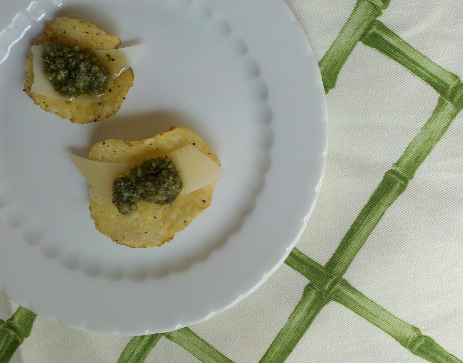 Place a shaving of Parmesan over appropriately-sized chip, then top with 1/2 tsp. pesto